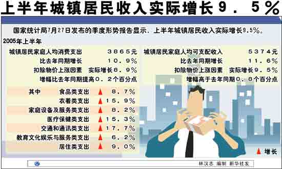 國家統(tǒng)計(jì)局進(jìn)行的抽樣調(diào)查顯示,上半年城鎮(zhèn)居民家庭人均可支配收入為5374元,比去年同期增長11.6%,扣除物價(jià)上漲因素,實(shí)際增長9.5%,增幅高于去年同期0.8個(gè)百分點(diǎn)。