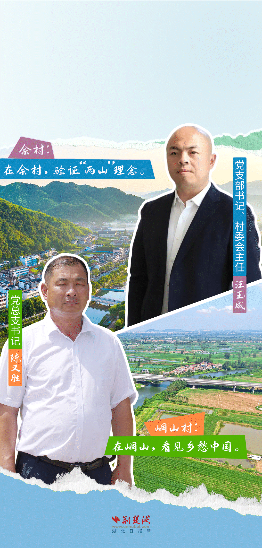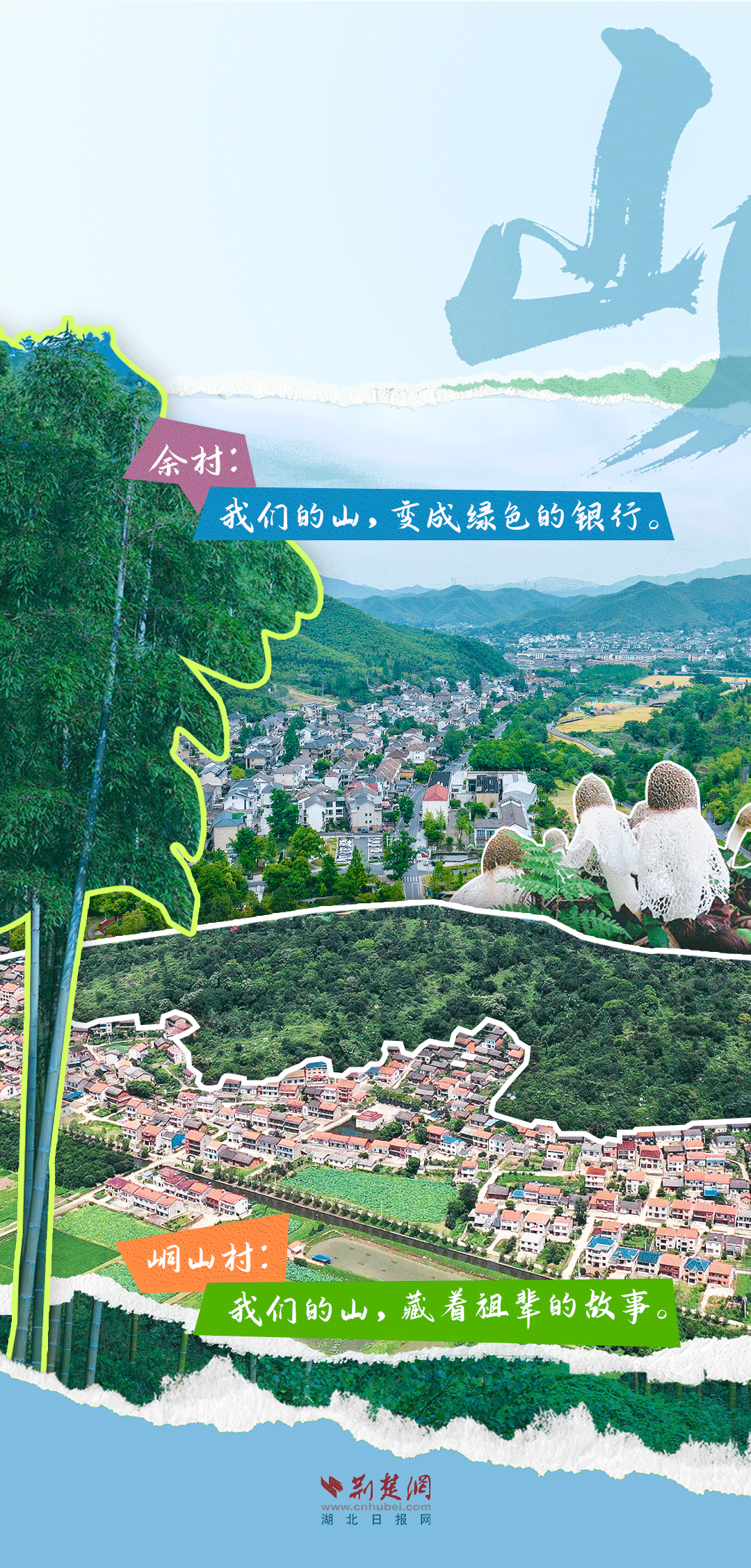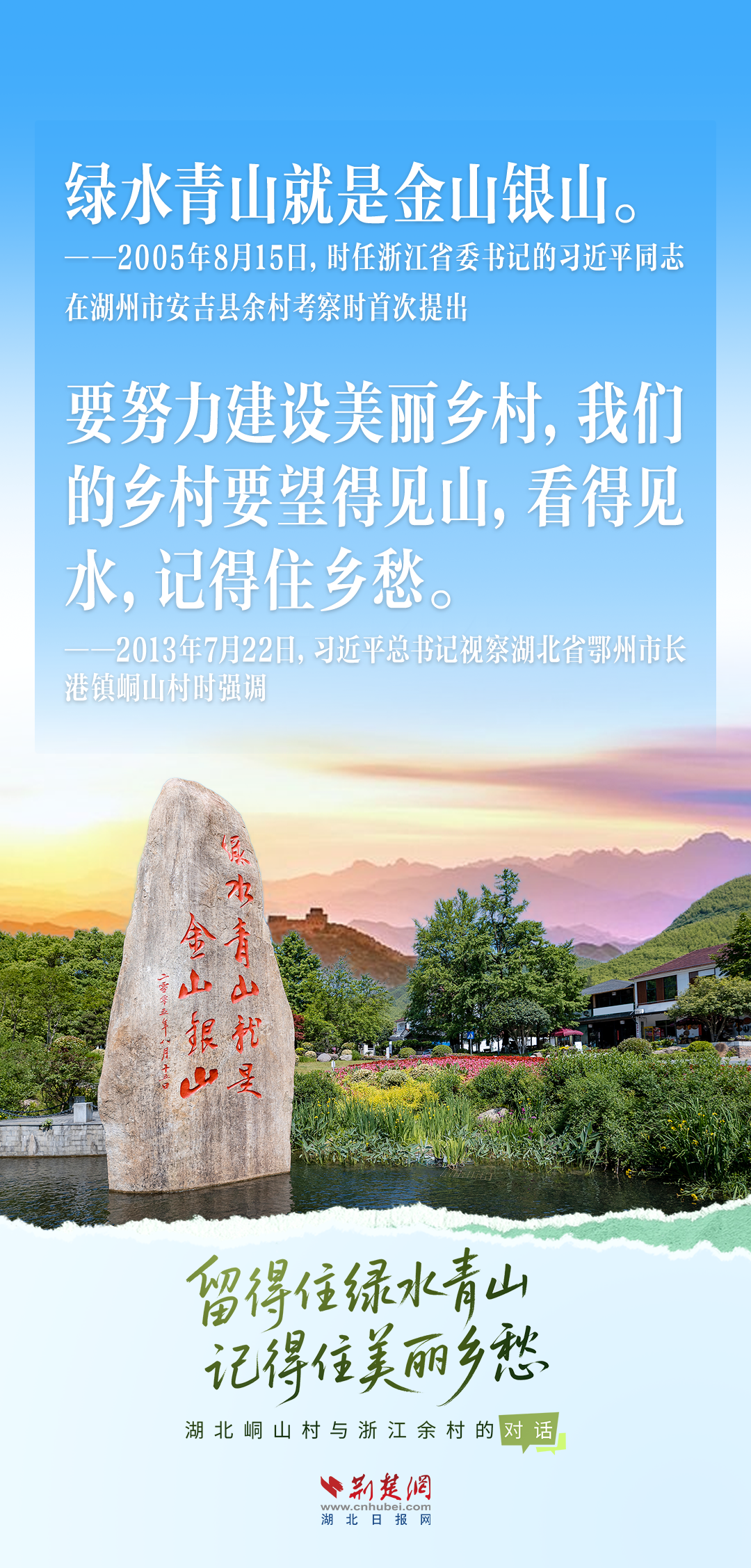 今天,荊楚網(wǎng)(湖北日?qǐng)?bào)網(wǎng))推出創(chuàng)意海報(bào)《留得住綠水青山,記得住美麗鄉(xiāng)愁——湖北峒山村與浙江余村的對(duì)話》,展示中國鄉(xiāng)村的美麗畫卷。