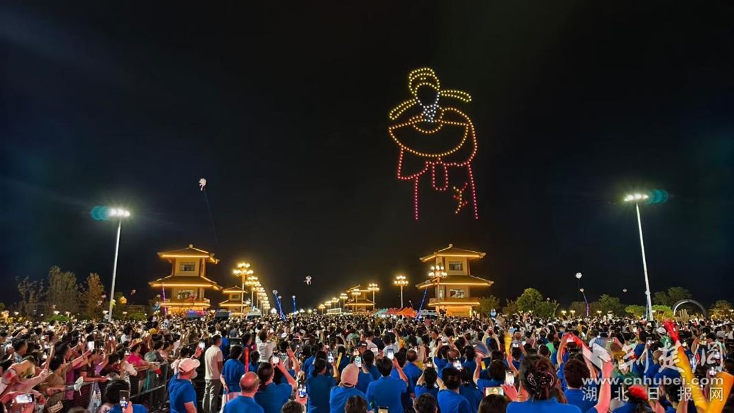 夜幕中,三百架無人機(jī)騰空而起,伴隨著悠揚(yáng)的黃梅調(diào),在天空中次第變幻出黃梅戲服、“莫錯(cuò)過”字樣等立體光影圖案,與兩岸璀璨燈光交織成一幅科技與藝術(shù)深度融合的絢麗畫卷,引來觀眾驚嘆連連。
