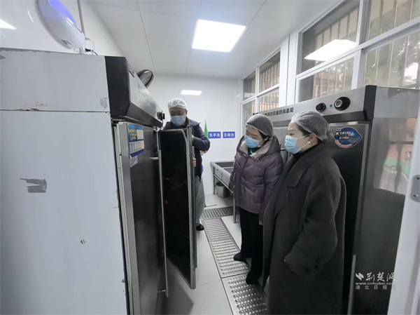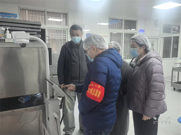人大代表查看后廚設(shè)備的運(yùn)行狀態(tài)及清潔消毒情況。 通訊員供圖