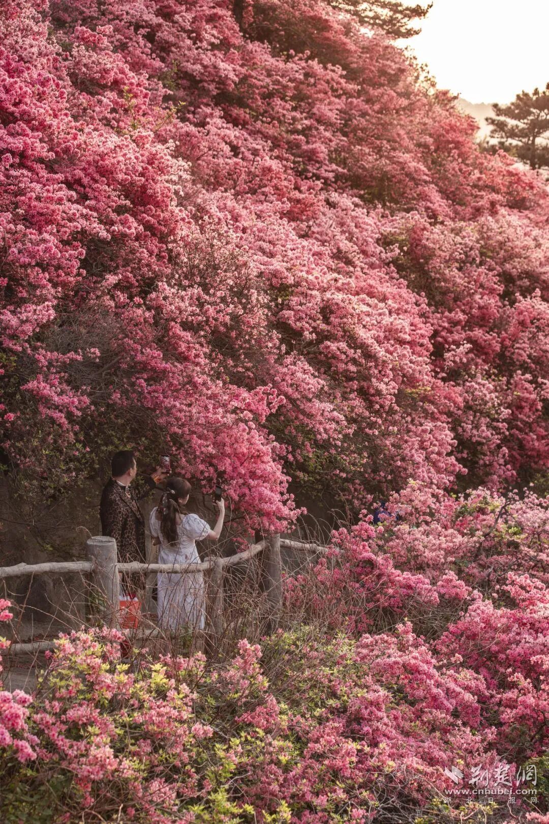 木蘭云霧山擁有武漢最大的高山杜鵑群落,擁有映山紅、白鵑梅等7個品種的野生杜鵑,總面積超過萬畝。依托不同海拔形成的立體氣候,杜鵑花呈現(xiàn)梯次開放格局,賞花期長達50天,可持續(xù)至5月初。
