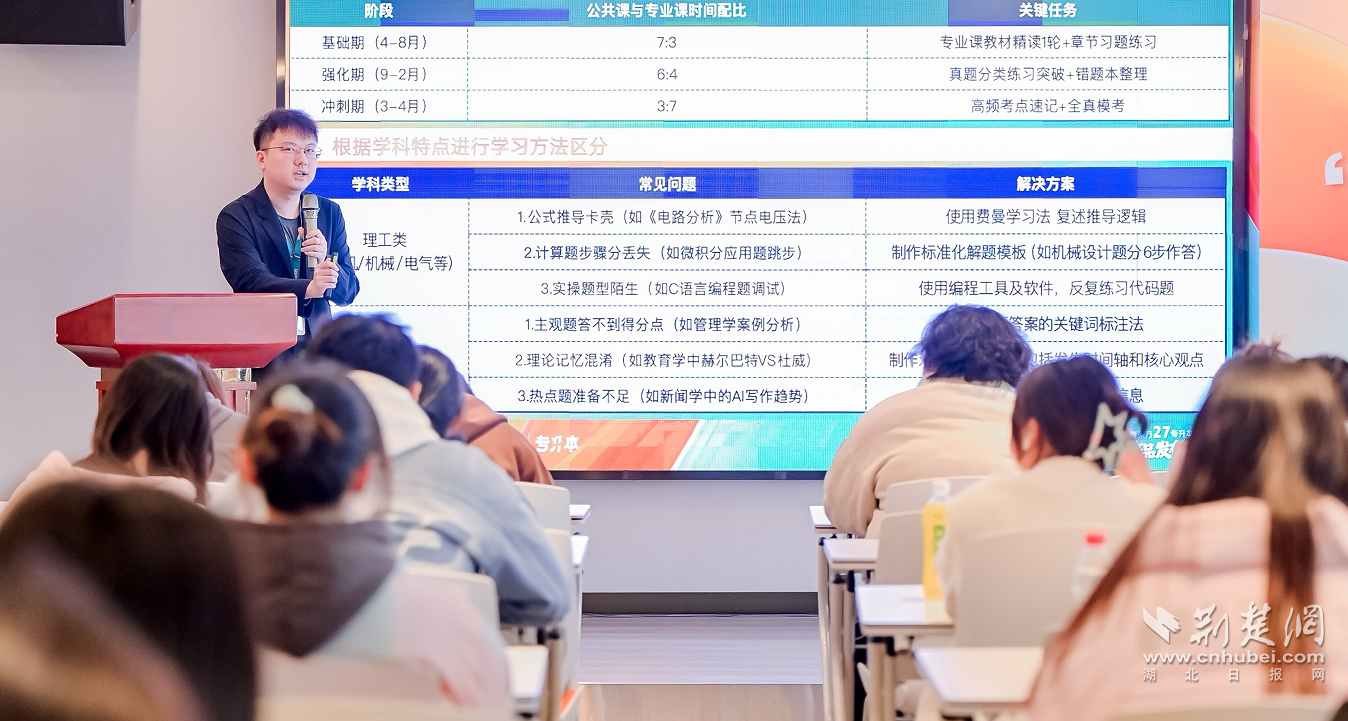 備考先知情,方能贏在起點(diǎn)。發(fā)布會(huì)上,教學(xué)負(fù)責(zé)人胡誠林,圍繞湖北省專升本公共課考情回顧及2027備考規(guī)劃展開詳細(xì)分享。他重點(diǎn)拆解了《大學(xué)英語》這一核心公共課的考試要求、題型迭代規(guī)律及難度變化趨勢(shì),針對(duì)考生最關(guān)心的詞匯積累、語法掌握、閱讀理解、書面寫作四大模塊,提供了可落地、可執(zhí)行的備考策略。從詞匯記憶的高效方法、語法考點(diǎn)的重點(diǎn)突破,到閱讀技巧的精準(zhǔn)運(yùn)用、寫作能力的分層提升,胡誠林老師進(jìn)行了全方位、系統(tǒng)化的解析,為考生搭建起清晰的公共課備考框架,幫助大家精準(zhǔn)把握備考節(jié)奏,做到游刃有余。