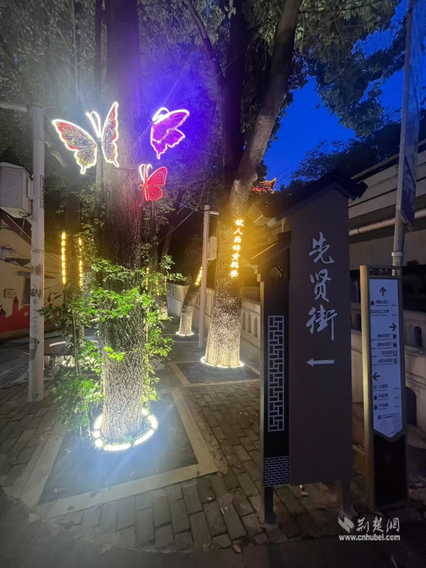 樹身燈帶嵌入“昔人已乘黃鶴去,此地空余黃鶴樓”等經(jīng)典詩句,夜色中詩句如星河流淌;地面投影燈投射動態(tài)詩行,游客漫步其間,仿若穿行于流動的詩卷。先賢街沿線搭配蝴蝶燈、玫瑰裝置,實現(xiàn)“一步一詩、一燈一景”的沉浸式體驗。燈光設計精準呼應黃鶴樓夜景,用光影勾勒街巷輪廓,烘托古城文藝氣息,讓老街巷的夜晚溫暖明亮,兼具顏值與氛圍。